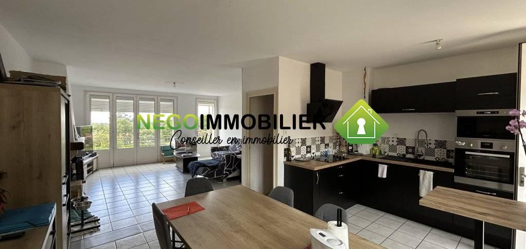 – Séjour lumineux avec cuisine ouverte aménagée et entièrement équipée (installation 2021), pour une surface d’environ 44 m²
