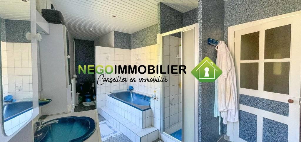 – Une salle de bain à l’étage, équipée d’une baignoire, d’une douche, d’un lavabo avec deux vasques et d’un WC